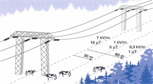 Kuva 1. 400 kilovoltin voimajohdon läheisyydessä esiintyvät suurimmat magneettivuon tiheydet ja sähkökentän voimakkuudet (Jokela 2002).