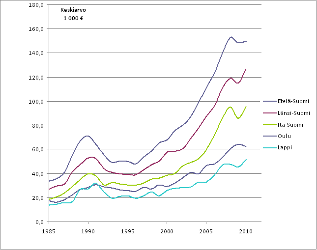 Rakennetun rantaan rajoittuvan lomakiinteistön hintakehitys (kaavio)