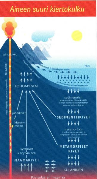 Kuva 1. Aineen suuri kiertokulku selittää kivilajiryhmien synty¬mekanismia. (Lehtinen et al. (toim.) 1998, s. 34).