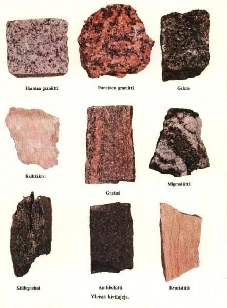 Kallioperä muodostuu siis eri kivilajeista ja nämä edelleen mineraaleista ja ne edelleen molekyyleistä. Yleiskuva Suomen kallioperästä selviää erinomaisesti esim. kirjasta (Lehtinen, M. et al. (toim.) 1998) sekä kallioperäkartasta (https://gtkdata.gtk.fi/Kalliopera/index.html). Kuvassa 2 on kuvattuna muutamia yleisimpiä kivilajejamme.