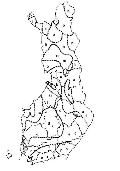 Kuva 3. Maanmittaustoimistojen toimialueet ja taulukon 1 mukaiset Suomen kallioperän kivilajialueet kuvattuna päällekkäin (Rahkila 2000, s. 13).