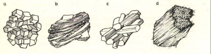 Kuva 4. Mineraalien asut: a) rakeinen, b) suomuinen, c) sälöinen ja d) kuituinen (Korhonen K-H. et al. 1974).